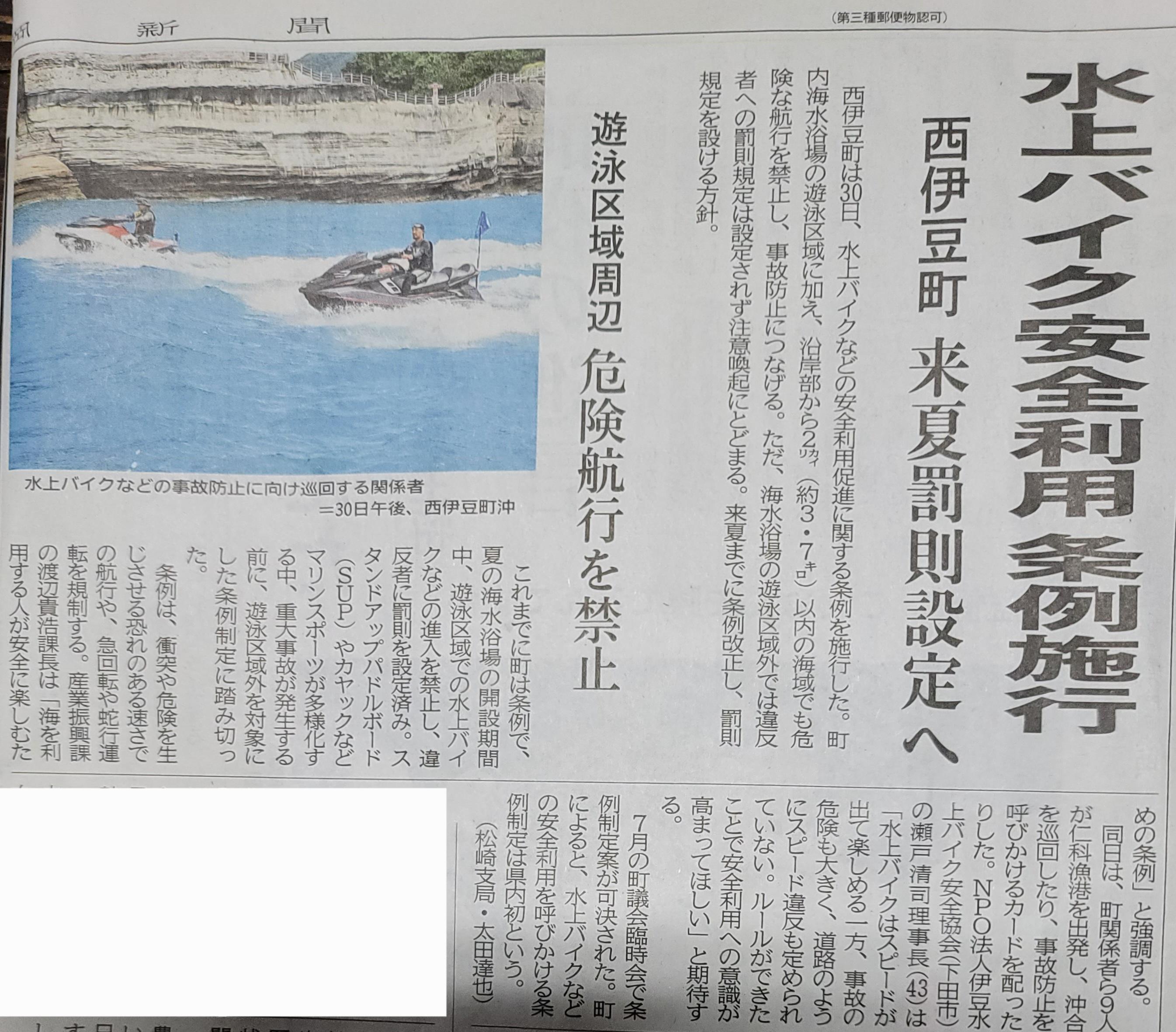条例施行に伴い西伊豆町役場職員と伊豆漁協組合員と瀬戸理事長・須田理事で実施したパトロール・広報活動が伊豆新聞に掲載されました。